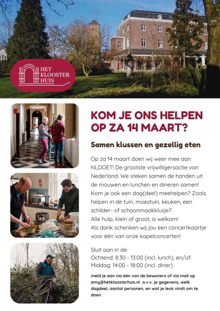 Daarnaast heten wij vrijwilligers van harte welkom op onze maandelijkse klussendagen. Deze vinden elke derde zaterdag van de maand plaats, tussen 08:30 en 14:30. We komen samen, kiezen een klus wat men goed past, drinken samen koffie/thee met gebak om 10:30 en lunchen samen om 13:00. Een gezellige, ongedwongen dag in samenzijn. Wij heten vrijwilligers van buitenaf van harte welkom! Wilt u ook eens op een klussendag komen? Stuur ons even een mailtje op info@hetkloosterhuis.nl, dan kunnen we u meer informatie geven.